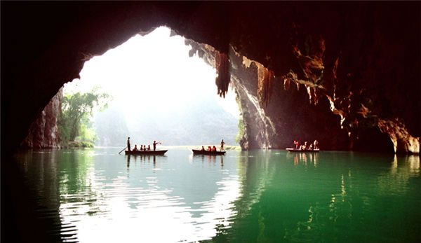 百鳥巖位于甲篆鄉(xiāng)烈屯西北面的漠齋山下,別名龍虎洞。因洞內(nèi)燕子棲集,蝙蝠掠飛,又名百鳥洞。盤陽河自吉屯白熊洞潛入山下,形成1000多米的伏流暗河后,在此洞流出。洞口寬50米,一石壁把洞口分成兩個略呈三角形的左右洞口。左側(cè)洞口寬40米,高15米,兩洞口內(nèi)側(cè)相通。洞深500米,蜿蜒曲折,直通與白熊洞一山之隔的拉類坳下的一個側(cè)洞口。洞中水平如鏡,深不可測,寬處約40米,窄處10米,從洞口行舟至300米轉(zhuǎn)折處,距水面30米處有一圓形天窗,山坳之光照到水面,猶如舞臺上的光束,色彩紛呈,近右側(cè)洞口處有沙灘,可?恐鄞。沙灘右側(cè)是一塊30多平方米的石臺,臺面深溝淺窩,坑坑坎坎,石臺一側(cè),洞壁雪白,可攀援其中。有石鷹、石柱、石幔、石觀音菩薩等,百態(tài)千姿,令人目不暇接。石臺的周圍有仙女梳妝、海螺石,石螺對面有石桌、石缸和石松果等。側(cè)面洞口外香椿林下野花艷目植被繁衍,把洞口點(diǎn)綴得幽靜雅致。洞中歧洞叉水道不可勝數(shù),密如蜂房,不知所向,整個洞仿佛一座裝飾華麗、景幻莫測的水下龍宮。其奇特的景象似桂林蘆笛巖,又因非乘舟不能游覽,游人贈予“水上蘆笛巖”的美譽(yù)。