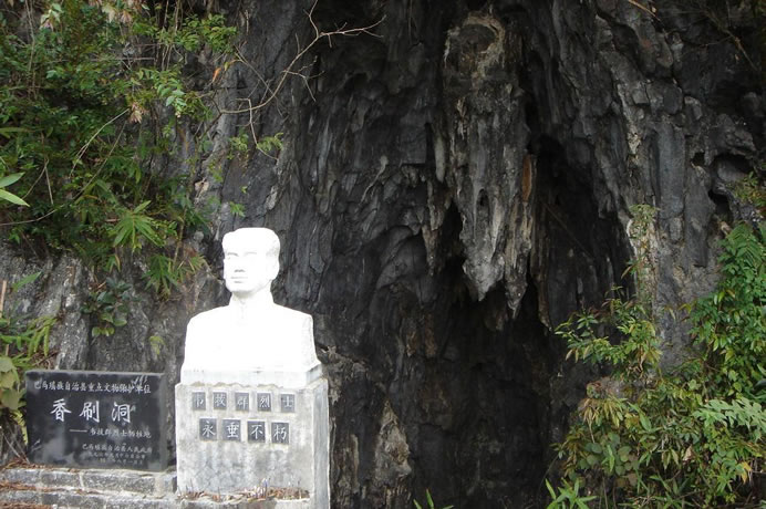 香刷洞位于西山鄉(xiāng)弄列村東北部的一座半山坡上,香刷洞為石灰?guī)r溶洞,洞口高5米,深10米,寬約6米,洞底型似臥底,洞中一年四季比較干燥,洞內(nèi)可容納20多人。洞內(nèi)右側(cè)一高處有一平臺,可以臥人,臺左側(cè)有一小洞穴可以匍伏出洞外。民國21年間(1932年)10月19日晚,堅持在右江斗爭的中國工農(nóng)紅軍獨(dú)立第三師師長韋拔群在戰(zhàn)略轉(zhuǎn)移中隱藏在此洞中,不幸被叛徒韋昂殺害,犧牲時僅38歲。香刷洞是巴馬瑤族自治縣縣級重點(diǎn)文物保護(hù)單位。