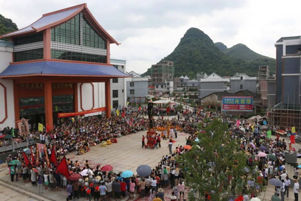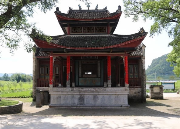 位于鐘山縣城西面公安鎮(zhèn)大田村,距縣城約十公里,此戲臺(tái)建于清光緒四年(即1878年),為磚、石、木結(jié)構(gòu),呈凸字形,通高10余米,由前臺(tái)和后臺(tái) 組成,前臺(tái)面寬6.37米,深5.5米;后臺(tái)寬10.12米,深3.6米;基高1.8米。整座戲臺(tái)青石青磚,雕工極為精美圓潤,八柱梁構(gòu)架,八角藻井復(fù) 頂,鼓石墊柱,青磚砌墻,青石為基,基旁雕以八仙賀壽,鑿雙龍以戲珠,臺(tái)上鏤兩虎以扶角,嵌二獅以呈瑞,后屏風(fēng)飾以山川樓閣,彩鳳仙鶴等木雕,工藝精湛, 構(gòu)圖和諧。戲臺(tái)除古樸典雅、雄偉壯觀,且符合力學(xué)、聲學(xué)原理,整座戲臺(tái)屬水口廟附屬建筑,隱映于古樹秀竹之中,清澈的溪流環(huán)繞其中,整個(gè)環(huán)境優(yōu)雅別致,清 靜恬適,為廣西不可多見的古戲臺(tái)之古代建筑之一。1981年列為廣西壯族自治區(qū)重點(diǎn)文物保護(hù)單位。該戲臺(tái)所處村莊大田村也是一個(gè)很有特點(diǎn)的村莊,老屋、古 榕、古樟在池塘的映襯下顯得特有韻味。