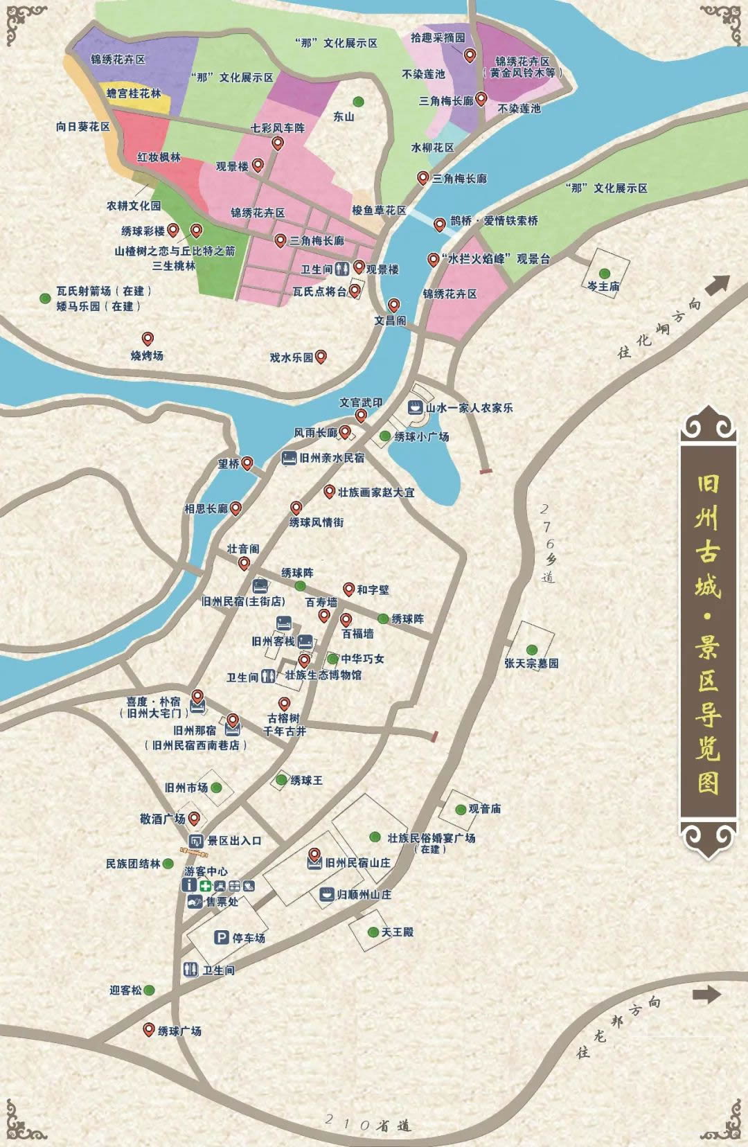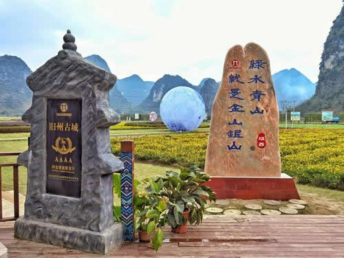 早在一千多年前,舊州古城就作為歸順州(靖西古名)的州府,一直是中越邊境線上重要的政治門戶、經(jīng)貿(mào)樞紐、文化中心和軍事要塞,是當(dāng)之無愧的“千年古城”,也是名揚四海的抗倭民族巾幗英雄瓦氏夫人的故鄉(xiāng)。舊州風(fēng)光旖旎,景區(qū)的文物勝跡甚豐,有文昌閣、瓦氏夫人點將臺、繡球風(fēng)情街、壯音閣、千畝錦繡花海、望橋、明清時代建筑岑氏土司廟、張?zhí)熳谀箞@等景觀。舊州風(fēng)光是靖西田園風(fēng)光的縮影,吸納了靖西近千年古樸典雅的文化底蘊,將自然景觀和人文薈萃融為一體。