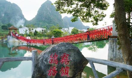 “情定舊州,霧鎖鵲橋”的典故源于“水?dāng)r火焰峰”的民間傳說——相傳,舊州古時候有一座老藤橋,是村民外出勞作的必經(jīng)之路,常有喜鵲聚集在兩旁的樹上嬉鬧。
