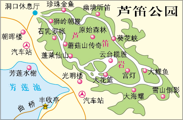 蘆笛巖位于桂林市西北桃花江畔,在光明山的南側(cè)山腰。洞口原長有一種蘆荻草,傳說可以做笛子,吹出悅耳動(dòng)聽的聲音,蘆笛巖因此得名。蘆笛巖的形成經(jīng)歷了漫長的年代,100萬年前這里原是一個(gè)古地下湖,由于地殼運(yùn)動(dòng)山體抬升,地下水位下降,地下湖變成了山洞。后來,雨水形成的地下水沿著山體中許許多多的破碎帶流動(dòng),溶解了巖石中的碳酸鈣,變成了含有碳酸根與鈣離子的溶液。當(dāng)?shù)叵滤畯膸r石縫隙流到洞中時(shí),二氧化碳溢出,鈣離子就沉淀結(jié)晶,經(jīng)過長年的積累形成千姿百態(tài)的鐘乳石,人們稱贊蘆笛巖是一座大自然的藝術(shù)之宮。遠(yuǎn)在1000多年前的唐代就有人來蘆笛巖游覽,蘆笛巖的石壁上留下了不少古人的墨跡,但歷代都沒有開發(fā)。蘆笛巖于1959年開始進(jìn)行勘測與建設(shè)。1962年正式對(duì)游人開放。