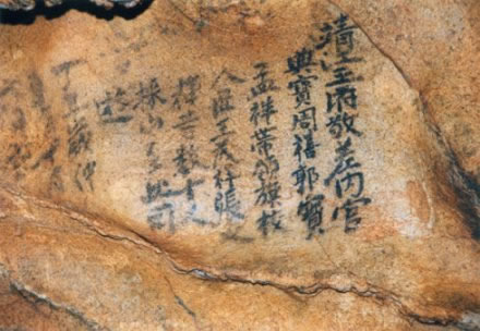 蘆笛巖壁書共有七十七則,其中唐代五則,宋代十一則,元代一則,明代四則,民國四則,年代無考者五十二則。大巖壁書共有九十三則,其中宋代一則,明代七十一則,清代八則,民國一則,年代無考者十二則。由此可以看出,兩洞壁書在年代分布上,有年可考的,蘆笛巖以唐宋為多、明代較少,清代沒有;而大巖則以明代為最多,清代次之,唐代、元代沒有,宋代僅一件。由于蘆笛巖壁書剝蝕嚴(yán)重,大巖壁書比較清晰可認(rèn),因此兩洞壁書在年代無考的數(shù)量上,又以蘆笛巖較多,大巖較少。就作者和內(nèi)容來說,蘆笛巖壁書有不少是文人、僧侶和游覽者的題名、題詩,作者來自全國各地;而大巖壁書則多為當(dāng)?shù)厝霂r者的紀(jì)事。此外,從大巖壁書的用語通俗、行文不順,以及錯(cuò)字、別字和書寫之劣來看,它似乎多為粗識(shí)文字者的手筆。兩洞壁書的不同之處,說明蘆笛巖是一個(gè)歷史悠久的游覽勝地,大巖則是明清時(shí)期當(dāng)?shù)厝罕姷谋茈y場所。 蘆笛巖壁書最早見于唐貞元六年(790年)洛陽壽武、陳臬、顏?zhàn)C、王溆等四人題名。以上四人,顏?zhàn)C曾為桂州刺史,王溆于同年與僧人道樹在虞山韶音洞有題名石刻。此外,蘆笛巖唐代墨跡尚有: “柳正則、柳存讓、僧志達(dá),元和元年二月十四日同游!薄盁o等、僧懷信、無業(yè)、惟則、文書、惟亮,元和十二年九月三日同游記!薄霸褪迥辏畷、道臻!