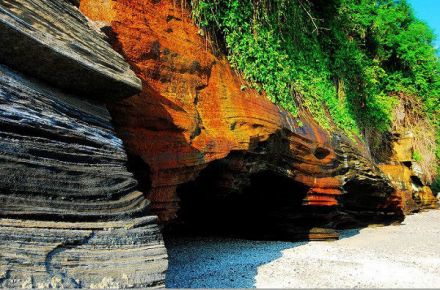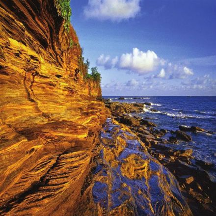 滴水丹屏原名滴水巖,位于潿洲島西部的滴水村,由巖石形成的懸崖峭壁是典型的海蝕地貌,裸露著的巖層,紅、黃、紫、綠、青五色相間,紋理十分清晰,崖頂之上藤樹(shù)纏繞,紅花綠葉倒掛崖頭,展現(xiàn)出旖旎多姿的色彩,故稱(chēng)“丹屏”。巨崖巖層上長(zhǎng)年涌動(dòng)著水珠,不斷地向崖下滴落,所以取名“滴水”。滴水丹屏的形成堪稱(chēng)是中國(guó)火山景觀的奇跡。