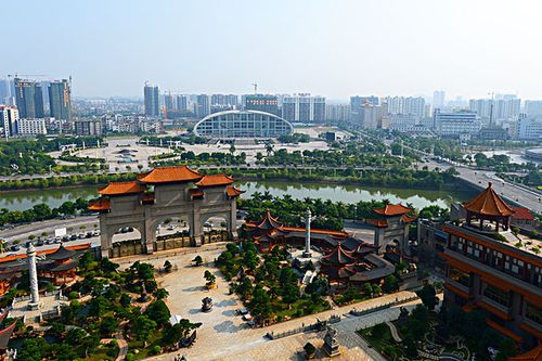云天文化城又稱云天宮,位于玉林市江濱路,南流江畔。是一座以濃縮中國古今傳統(tǒng)文化和著名建筑風(fēng)格為一體的巨型仿古宮殿式建筑。占地面積為14萬平方米,主體建筑高21層共108米。云天文化城以石雕、木雕、鑄銅三大系列藝術(shù)性的呈現(xiàn)中華名族的歷史文化,以創(chuàng)新的手法為中國上下五千年的文化做傳承。點睛之作是六樓閣樓高30米,重達600噸用1千多片銅片組成的硫金鑄銅工藝品“皆大歡喜”。