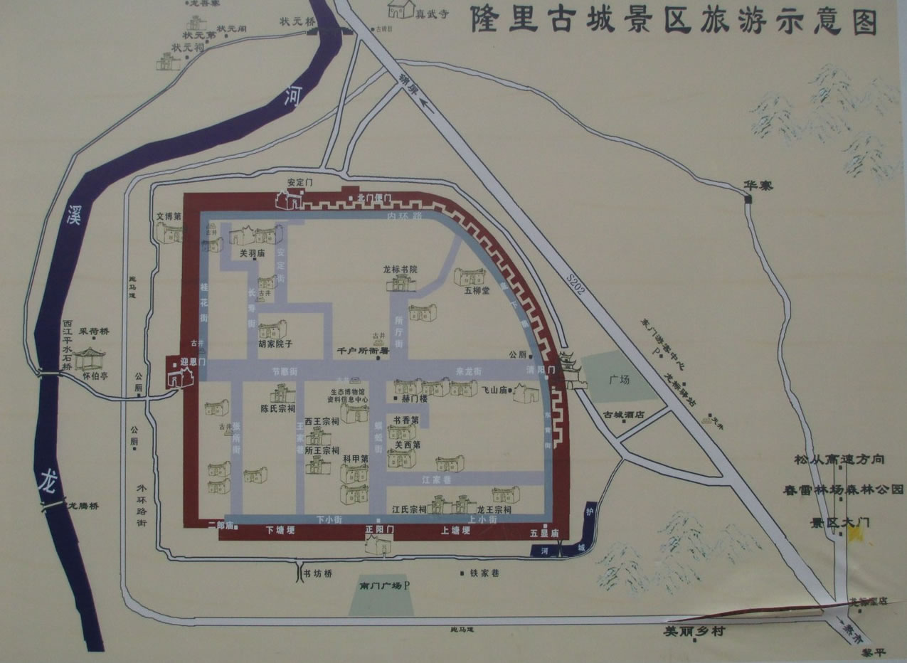 古城近似長方形,南北寬217米,東西長222米。城垣始建為泥土夯筑,天順元年(1457年)改以卵石框邊。周長1500米,城墻高一丈二尺,壕深一丈。 城周三里三分,東南西北各設(shè)炮臺一座。全城設(shè)東南西北四道城門,東門為清陽門,又名戌門,門上建有三層高戌樓。東門主要是作為官員、軍隊(duì)等進(jìn)城之門,取“紫氣東來”之意。南門為正陽門,西門稱迎恩門,除了門上建有兩層戌樓外,還設(shè)置了內(nèi)外兩道城門,即在門洞前筑有一堵圍墻,出門洞后需轉(zhuǎn)九十度彎再出一道門才能到達(dá)城外。這結(jié)構(gòu)被隆里人稱為“勒馬回頭”。古語中“北”、“敗”音相近意可互通,而“敗”字無疑犯了兵家之大忌,故北門常年閉門不開,且為取其藏風(fēng)聚氣之說,在北門上城樓上設(shè)有寺廟,供奉有菩薩,以祈求平安。城墻上設(shè)有跑馬道,城壁設(shè)有“天燈座”,用以傳遞訊息。古城墻外有護(hù)城河,以防敵人侵襲。