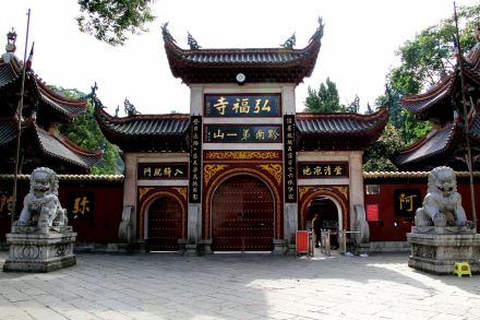 弘福寺為全國重點(diǎn)開放寺廟之一。清康熙十一年(1672年)由赤松和尚創(chuàng)建。“弘!倍帜恕昂敕鸫笤福热饲笫,福我眾生,善始善終”之意。沿九曲徑,經(jīng)二十四拐,可抵達(dá)弘福寺。弘福寺主要建筑有法化塔、九龍壁、大山門、鐘鼓樓、天王殿、觀音殿、大雄寶殿、玉佛殿、藏經(jīng)樓、說法堂、客堂、雙桂樓及方丈苑;有碑廊、素香齋、五觀堂和五百羅漢堂等大小建筑72座,加上放生池與茶樓等處,占地近11433平方米。徑旁摩崖石刻不絕,其中“虎”字高6米余,題名岱山趙德昌書,實(shí)為清著名書畫家孫清彥(竹雅)代筆。寺后象王嶺望城臺上(海拔1270米),建有“瞰筑亭”(1986年春劉海粟大師親書)。