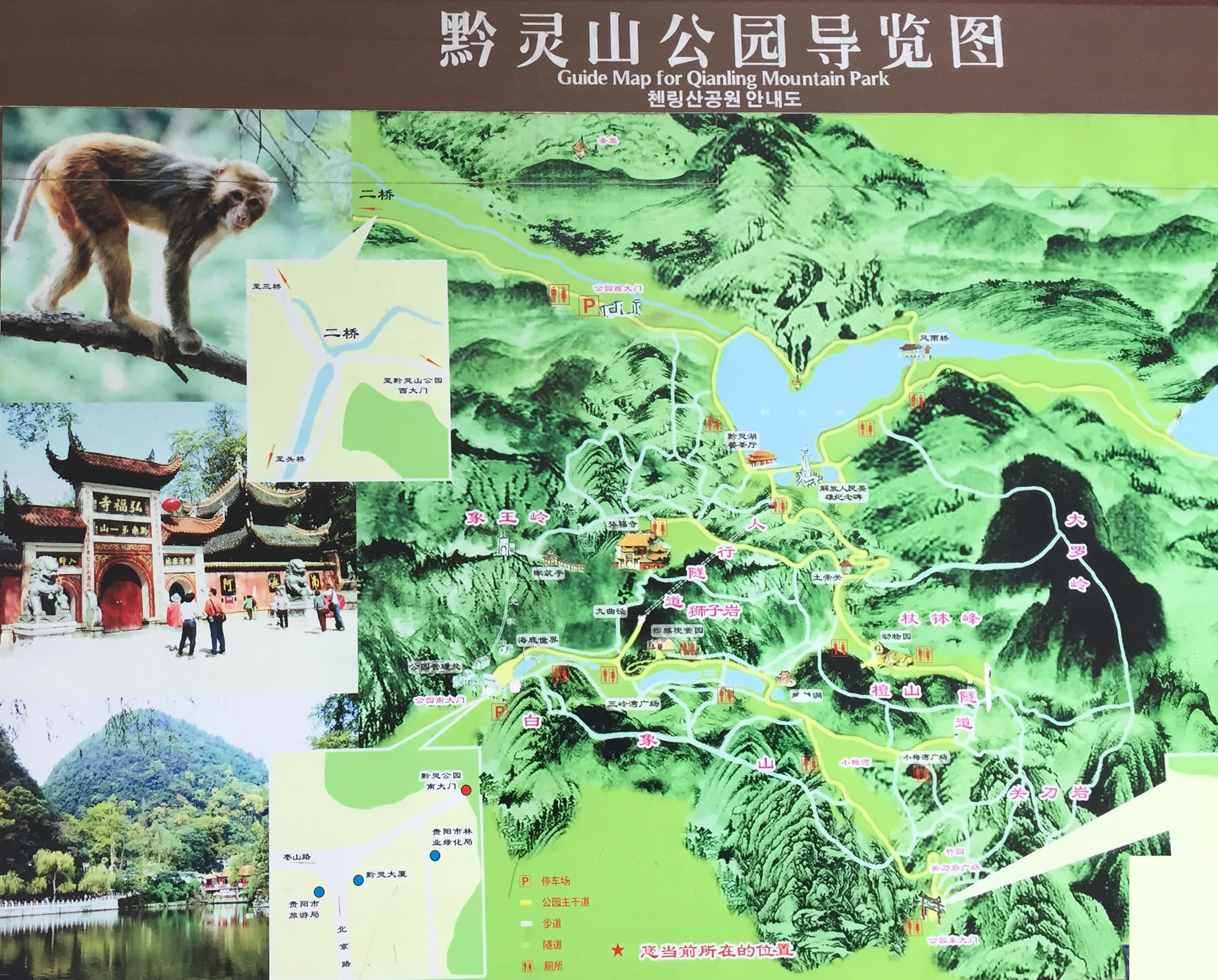 黔靈山公園是集自然風(fēng)光、文物古跡、民俗風(fēng)情和娛樂休閑為一體的綜合性公園,因素有"黔南第一山"之稱的黔靈山而得名。黔靈山由弘福寺、黔靈湖、三嶺灣等六個(gè)大的瀏覽區(qū)構(gòu)成,以山幽林密、湖水清澈為特色,集山、林、泉、湖、洞、寺、動(dòng)物于一體,有“貴在城中,美在自然”之稱。黔靈山前有麒麟洞、古佛洞、洗缽池等古跡,山上生長著1500余種樹木花卉和1000多種藥材。