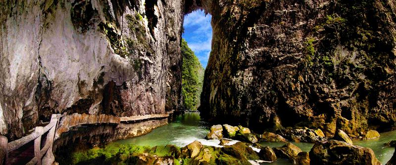 鴛鴦湖是小七孔一奇景,湖水如油,碧綠而凝重。因湖中有兩棵并排參天的大樹而得名,這兩棵大樹半截在水中,枝葉則在上方交握,雌樹纖巧,雄樹則兩三人才能環(huán)抱過來,雄壯挺拔。湖面幽靜,水道四通八達。