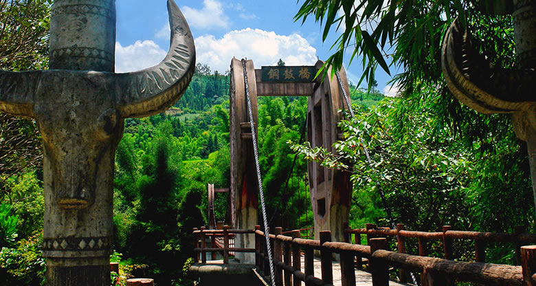 橋長126米,凈跨60米,寬2.4米,高25米,橋身兩端采用瑤山瑤族銅鼓造型,瑤族將銅鼓視為神賜之物,鎮(zhèn)寨之寶,是權(quán)力的象征。橋頭設立的圖騰柱代表著瑤族的尊嚴和崇拜,柱身上的浮雕圖案展示了瑤族傳統(tǒng)、獨特而古老的民族文化,具有濃郁的地方民族特色。