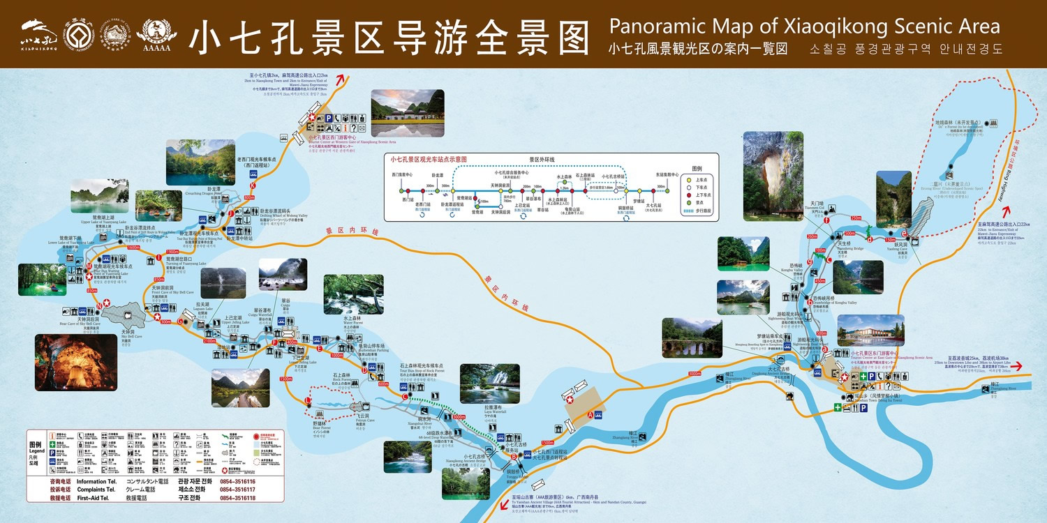 小七孔古橋建于清道光十五年(1835年),古為黔南通往廣西商旅交通要道,橫跨響水河。橋長40米,寬2.2米,高5.5米,橋體取拱形,結(jié)構(gòu)玲瓏。橋首原存石碑兩座,一為《修碑》,銘筑橋功德;一為《萬古興橋碑》,刻有“群山巖浪千千歲,響水河橋萬萬年”聯(lián)句。橋腹七孔,俗稱“小七孔古橋”。主要有小七孔古橋、拉雅瀑布、68級跌水瀑布、石上森林、野豬林、水上森林、天鐘洞、臥龍?zhí)丁Ⅷx鴦湖等21個景點。