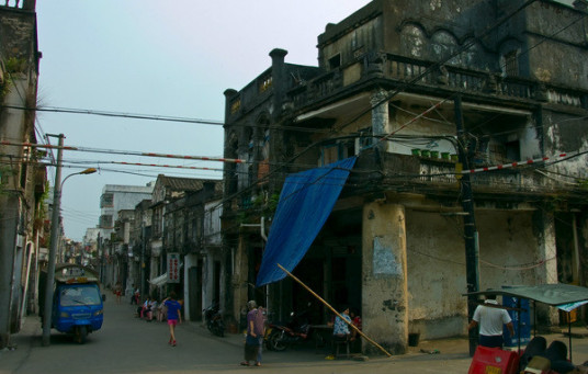 據(jù)史書記載,定安古城從籌建到1519年竣工共費時13年。城圍長近千米,高四米多,寬五米多,開有東、南、西城門,各建有城樓。北門是1545年才開的,后來因不堪倭寇的騷擾,曾經(jīng)堵上過,直到1690年才又重開。古城的城墻在建國初期就已經(jīng)被拆毀了,城門這一塊大概是因為看它結(jié)實牢固,便利用來建了樓房,因此還被保存下來。城門洞里放著兩只卸了龍頭的龍舟,已經(jīng)很舊,架在木樁子上。地是用青石板鋪設(shè)的,經(jīng)過幾百年人來人往,石板被磨得很薄。門洞里的墻面上也是一塊塊青石磚砌的,摸上去很干爽,一點也沒有陳年的霉味。