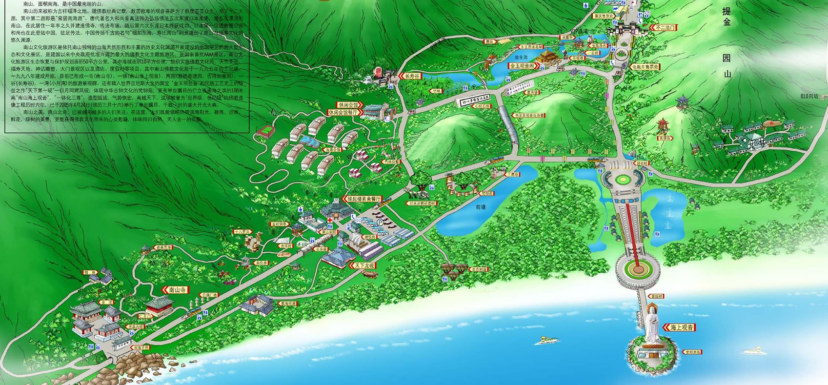 三亞南山風(fēng)景區(qū)是國(guó)家旅游局確定的“中國(guó)旅游業(yè)發(fā)展優(yōu)先項(xiàng)目”。它位于中國(guó)唯一的熱帶濱海城市三亞市的西部,是全國(guó)罕見(jiàn)的超大型文化和生態(tài)旅游園區(qū)。園區(qū)規(guī)劃面積五十平方公里,其中海域面積十多平方公里,由美國(guó)紐約國(guó)際城市設(shè)計(jì)公司統(tǒng)籌規(guī)劃,美國(guó)經(jīng)濟(jì)咨詢聯(lián)合公司提供可行性報(bào)告。項(xiàng)目?jī)?nèi)容策劃分別由中國(guó)佛教文化研究所、中國(guó)民俗學(xué)會(huì)、中國(guó)歷史博物館、中央民族大學(xué)、中國(guó)環(huán)境科學(xué)院、中國(guó)科學(xué)院生態(tài)中心完成。該項(xiàng)目是海南省的重點(diǎn)建設(shè)項(xiàng)目,同時(shí)被三亞南山風(fēng)景區(qū)是國(guó)家旅游局確定的“中國(guó)旅游業(yè)發(fā)展優(yōu)先項(xiàng)目”。它位于中國(guó)唯一的熱帶濱海城市三亞市的西部,是全國(guó)罕見(jiàn)的超大型文化和生態(tài)旅游園區(qū)。園區(qū)規(guī)劃面積五十平方公里,其中海域面積十多平方公里,由美國(guó)紐約國(guó)際城市設(shè)計(jì)公司統(tǒng)籌規(guī)劃,美國(guó)經(jīng)濟(jì)咨詢聯(lián)合公司提供可行性報(bào)告。項(xiàng)目?jī)?nèi)容策劃分別由中國(guó)佛教文化研究所、中國(guó)民俗學(xué)會(huì)、中國(guó)歷史博物館、中央民族大學(xué)、中國(guó)環(huán)境科學(xué)院、中國(guó)科學(xué)院生態(tài)中心完成。該項(xiàng)目是海南省的重點(diǎn)建設(shè)項(xiàng)目,同時(shí)被海南省授予“海南省生態(tài)建設(shè)示范工程”、“海南省生態(tài)旅游示范景區(qū)”,并得到了中央有關(guān)部門(mén)、佛教界、文化界的高度重視。它的建成填補(bǔ)了海南歷史文化旅游的空白,進(jìn)一步突出海南大生態(tài)旅游優(yōu)勢(shì),為中國(guó)旅游添光增彩。