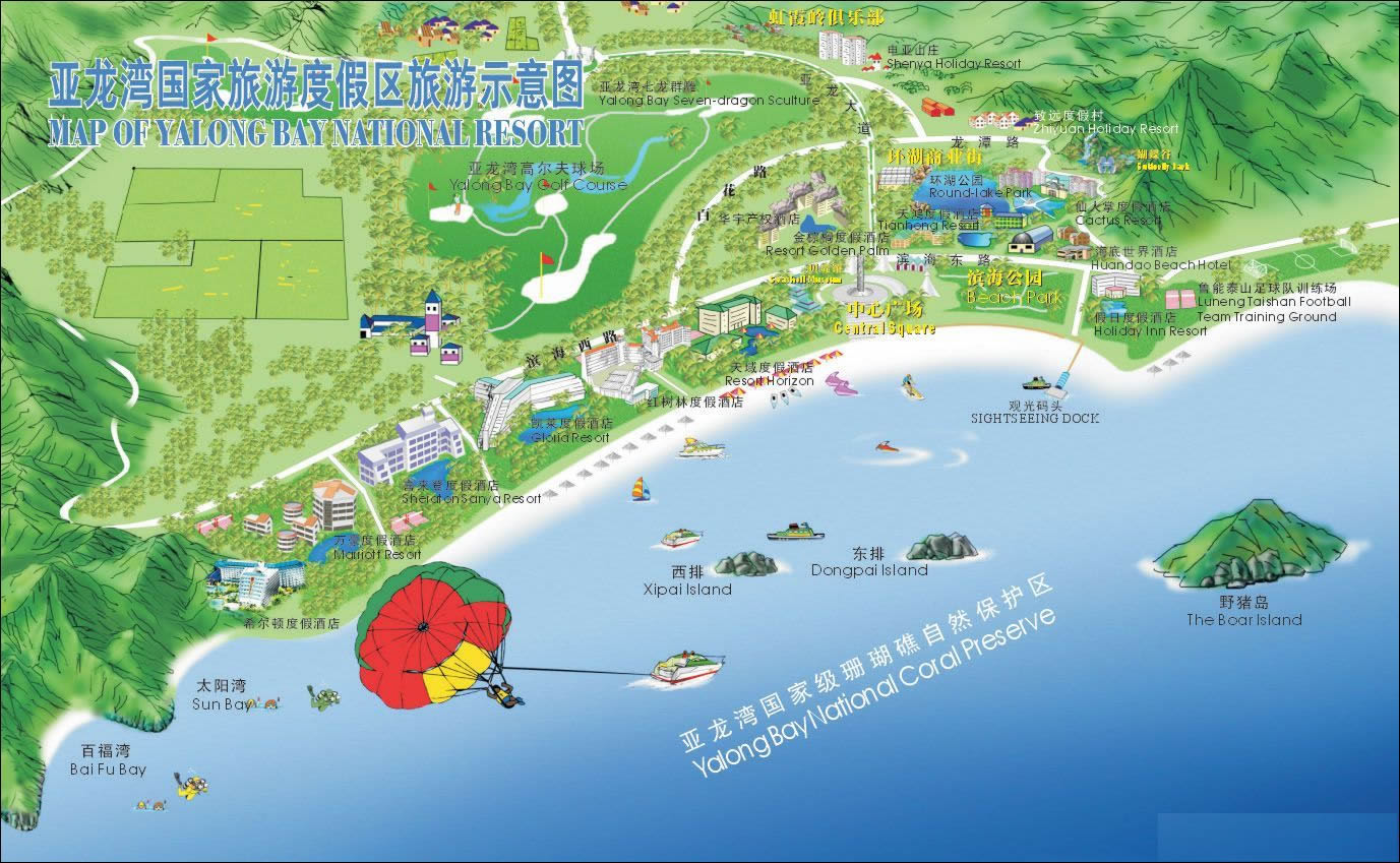 亞龍灣國(guó)家旅游度假區(qū)是1992年10月4日經(jīng)國(guó)務(wù)院批準(zhǔn)、我國(guó)唯一具有熱帶風(fēng)情的國(guó)家級(jí)旅游度假區(qū)。度假區(qū)位于中國(guó)最南端的熱帶濱海旅游城市--三亞市東南面二十五公里處,規(guī)劃面積18.6平方公里,是一個(gè)擁有濱海公園、豪華別墅、會(huì)議中心、高星級(jí)賓館、度假村、海底觀光世界、海上運(yùn)動(dòng)中心、高爾夫球場(chǎng)、游艇俱樂(lè)部等國(guó)際一流水準(zhǔn)的旅游度假區(qū)。