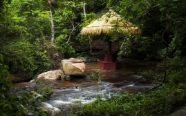 蘭花溪將中國傳統(tǒng)造園技巧與熱帶雨林文化進(jìn)行結(jié)合,附近有花草、茅草屋、徒步小道,長藤下分布有樹桌椅。