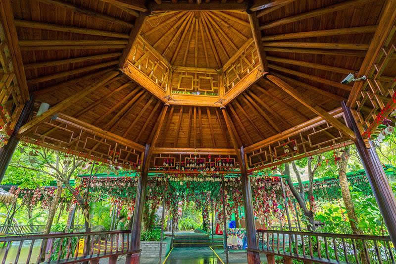 幸福桐亭是因亭子附近有三棵黃桐樹而命名的,桐亭周圍掛滿由黎族阿婆用觀音草編制而成的風(fēng)鈴,風(fēng)鈴上獨(dú)特的圖案是黎族的守護(hù)神“大力金剛神”,該圖案由牛頭和青蛙上下兩個(gè)部分組成。桐亭與幸福天道相連,幸福天道上有四道門:友情門、愛情門、親情門和幸福門。