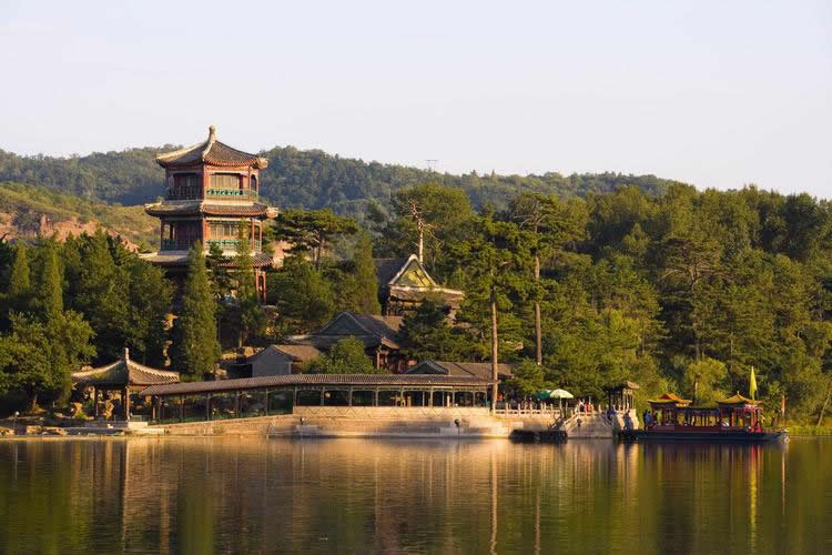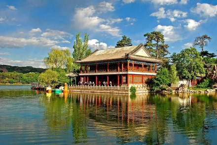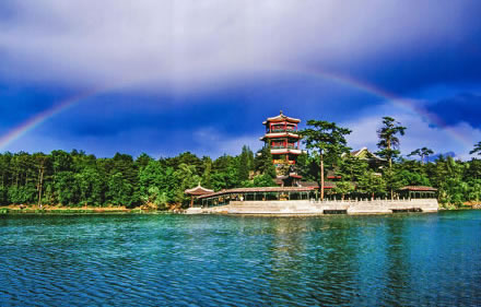 湖泊區(qū):苑景區(qū)的精華基本上在湖泊區(qū),康熙曾夸耀說,“天然風(fēng)景勝西湖”。由于洲島錯(cuò)落,湖面被長堤和洲島分割成5個(gè)湖,各湖之間又有橋相通,兩岸綠樹成蔭,山莊主要的風(fēng)景建筑又都散落在湖區(qū)的周圍,因此顯得曲折有致,秀麗多姿。湖泊區(qū)位于山莊東南,面積49.6萬平方米。有大小湖泊八處,即西湖、澄湖、如意泅、上湖、下湖、銀湖、鏡湖及半月湖,統(tǒng)稱為塞湖。 湖區(qū)的風(fēng)景建筑大多是仿照江南的名勝建造的,如“煙雨樓”,是模仿浙江嘉興南湖煙雨樓的形狀修的。金山島的布局仿自江蘇鎮(zhèn)江金山。湖中的兩個(gè)島分別有兩組建筑,一組叫“如意洲”,一組叫“月色江聲”!叭缫庵蕖鄙嫌屑偕、涼亭、殿堂、廟宇、水池等建筑,布局巧妙,是風(fēng)景區(qū)的中心!霸律暋笔怯梢蛔碌乃暮显汉蛶鬃、堂組成。每當(dāng)月上東山的夜晚,蛟潔的月光,映照著平靜的湖水,山莊內(nèi)萬籟俱寂,只有湖水在輕拍堤岸,發(fā)出悅耳的聲音,“月色江聲”的題名便是由此而來。湖泊區(qū)集南方園林之秀和北方園林之雄,將江南園林的景觀移植到塞外。區(qū)內(nèi)湖泊總稱“塞湖”,總面積57公頃。