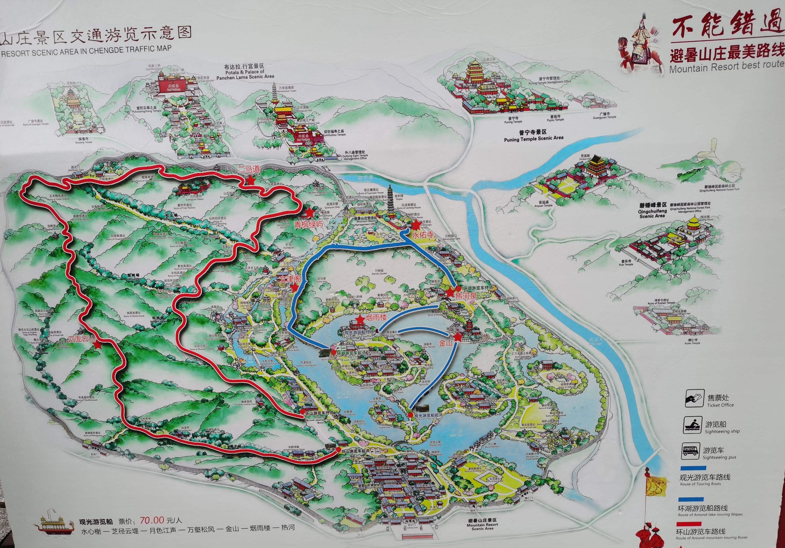 山巒區(qū):位于山莊西北部,面積443.5萬平方米。山區(qū)占了整個(gè)園林面積的五分之四。從西北部高峰到東南部湖沼、平原地帶,相對(duì)高差180米,形成了群峰環(huán)繞、色壑縱橫的景,山谷中清泉涌流,密林幽深。高聳的山峰好似天然屏障,阻擋了西北寒風(fēng)的侵襲,是調(diào)節(jié)山莊氣候的重要因素。當(dāng)年利用山峰、山崖、山麓、山澗等地形,修建了多處園林、寺廟,共計(jì)40余處。
