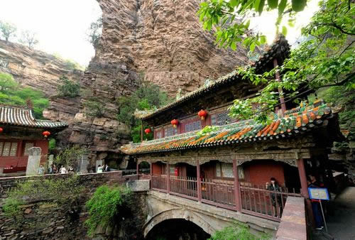 一絕“橋樓殿”。橋凌駕于百仞峭壁之間,仰視藍(lán)天一線,俯首萬(wàn)丈深淵。形制如同趙州橋敞肩拱式。橋上建樓,云飛樓動(dòng),樓內(nèi)建殿,殿內(nèi)三尊大佛。真是“千丈虹橋望入微,天光云彩共樓飛”,不是仙境勝似仙境,疑是天堂落塵!,F(xiàn)為中國(guó)三大懸空寺之一。