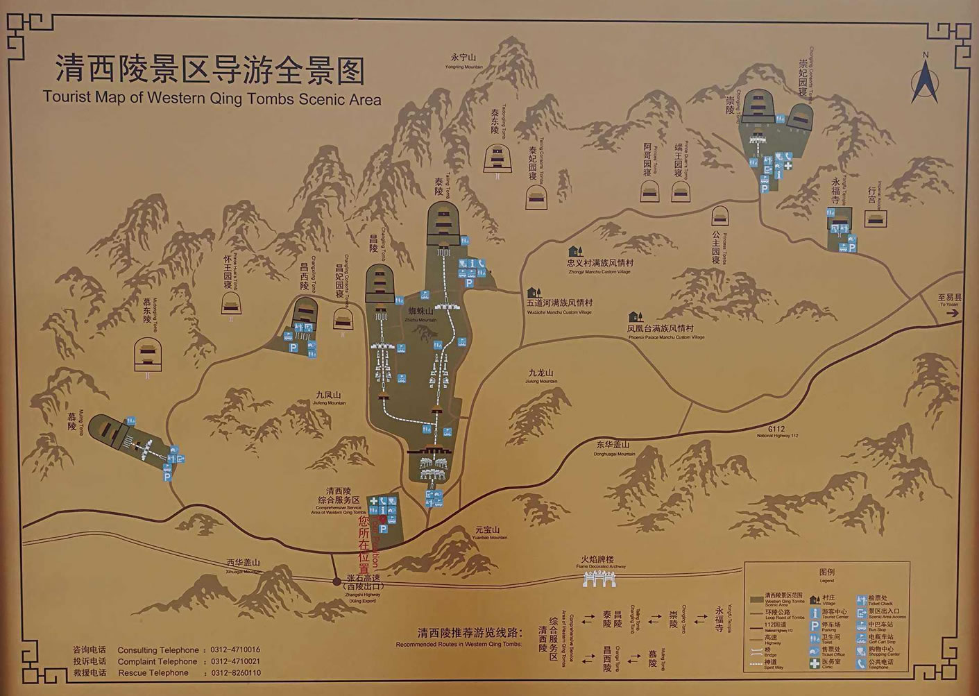 清西陵陵區(qū)內(nèi)各陵園共用祖山、石牌坊、大紅門,周圍均用風水圍墻和火道、界樁圍繞。陵寢布局有主有從,皇后陵和妃園寢均以本朝帝陵為中心,分建左右,自成一區(qū),體現(xiàn)了附屬關(guān)系,表明陪葬之意。各帝陵神道均與主陵神道相接,后陵神道與本朝帝陵神道相接,形成枝狀的神道網(wǎng)絡(luò)。這些特點是清代以前的歷代皇陵所不具備的。整個清西陵陵區(qū)以清世宗雍正帝的泰陵為中心,西面分布著清仁宗昌陵和清宣宗慕陵,東面分布著清德宗崇陵、溥儀墓以及阿哥、公主園寢和永福寺等建筑。