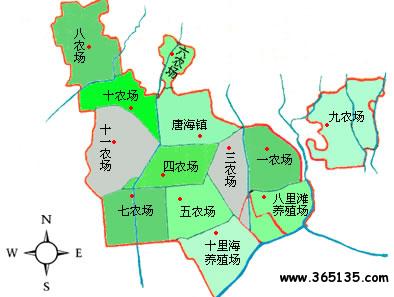 唐?h轄1個(gè)鎮(zhèn)、11個(gè)農(nóng)場、2個(gè)養(yǎng)殖場:
