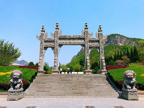 媧皇宮山門,坐東朝西,有三孔磚砌拱門組成。兩邊兒對聯(lián)寫著:鳳山名隆仙島;神仙勢壓十洲。橫批是:蓬壺仙境。進(jìn)了門是木牌坊,上額書寫“媧皇古跡”。牌坊西是皮瘍廟,塑著皮瘍王和魯班的神像。牌坊東樹一通古牌,上寫《古中皇山》。走過牌坊,東面峭壁上有北齊時的磨崖刻經(jīng)。再往前走是石券門,頂上建鼓樓。券額上刻著“中州勝景”四個大字 。