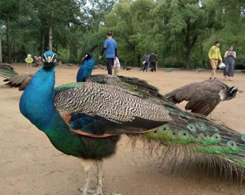 世界瀕危野生動物綠孔雀在秦皇島野生動物園不斷繁衍生息,已從1949年的20余只繁育到80只,成為中國最大的綠孔雀群。綠孔雀俗名:孔雀、越鳥、爪哇綠孔雀;體型最大的雉科鳥類,體重7000-8000克。雄鳥全長約140厘米,雌鳥約100厘米。雄鳥體羽翠藍綠色,下背閃紫銅色光澤。頭頂有一簇直立的羽冠。尾上覆羽延伸成尾屏,可達1米以上,約有百余枚,并有紫、黃、藍、綠多種顏色構成的眼狀斑紋,形成孔雀特有的尾屏。開屏時顯得異常艷麗、光彩奪目。雄鳥尾特長,頭部冠羽豎起,頸、上背及胸部具綠色光澤,尾上覆羽特長并具閃亮眼斑而成尾屏。雌鳥羽色以褐色為主,帶綠色輝光。無尾屏。