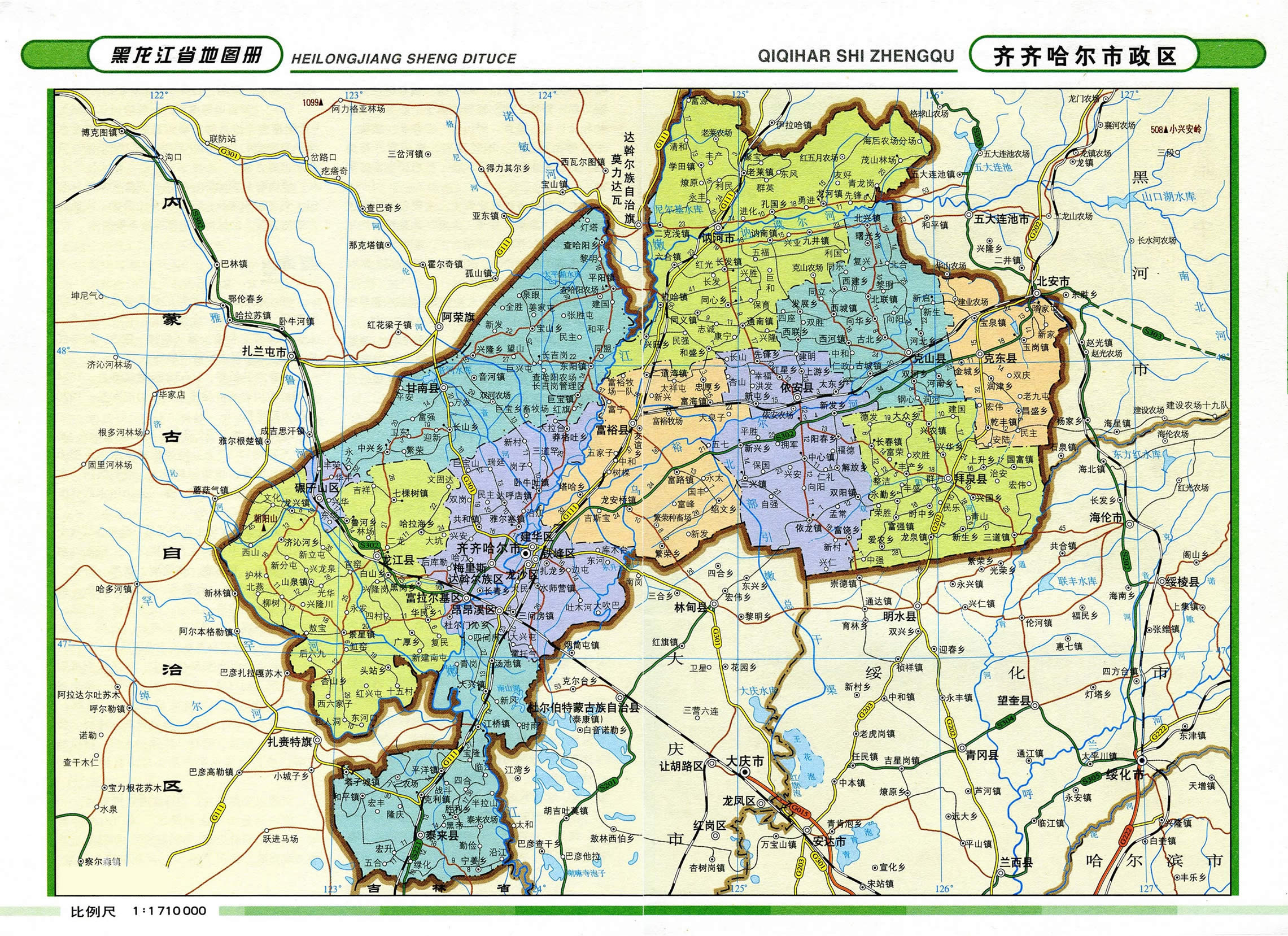 齊齊哈爾市轄7個市轄區(qū)、8個縣,代管1個縣級市: