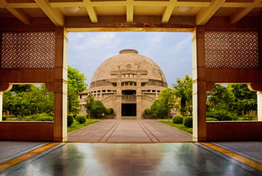 印度佛殿苑方正嚴(yán)謹,中心是一個巨大的覆缽式穹窿頂,佛殿下水流往來,噴涌不斷;佛殿外回廊環(huán)繞,靜謐整齊。一座具有印度古典風(fēng)格的佛教建筑,與中國傳統(tǒng)的佛教寺院并立,她是中印兩國人民世代友好的象征。