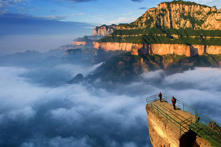 云峰畫(huà)廊是一條畫(huà)廊式的風(fēng)光帶,位于老爺頂?shù)陌肷窖,由清峰關(guān)起,環(huán)周8千米,終點(diǎn)又回到清峰關(guān)。它依附老爺頂,連接豫晉關(guān),遙望十字嶺,擷取太行山的精華,依山順勢(shì)建造了7個(gè)位置極佳的觀景臺(tái),依次為聽(tīng)禪臺(tái)、試膽臺(tái)、如畫(huà)臺(tái)、戲龍臺(tái)、丹鳳臺(tái)和歸真臺(tái)。