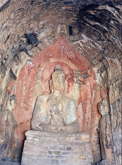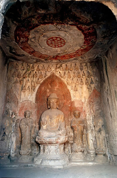 賓陽中洞是北魏時(shí)期(公元386~512年)的代表性作品。這個(gè)洞窟前后用了24年才建成,是開鑿時(shí)間最長的一個(gè)洞窟。洞內(nèi)有11尊大佛像。主像釋迦牟尼像,面部清秀,神情自然,堪稱北魏中期石雕藝術(shù)的杰作。主像座前刻有兩只姿態(tài)雄健的石獅。左右侍立二弟子,二菩薩,菩薩像含笑凝眸,溫柔敦厚。洞中還雕刻著眾菩薩,弟子聽法的浮雕像,栩栩如生。窟頂飛天仙子的刻畫也十分傳神。