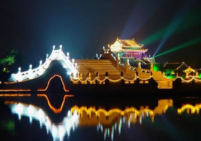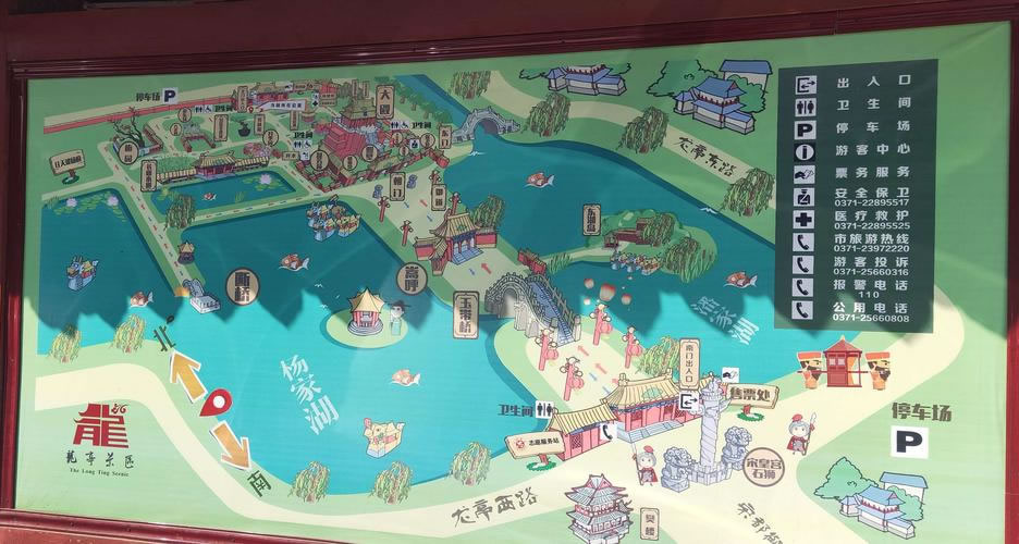 開封是中國六大古都之一,作為北宋王朝的都城達(dá)167年之久。當(dāng)時(shí)的宋京極為繁盛,宮殿建筑很輝煌?上Ы鹑饲终奸_封時(shí),宋皇宮建筑大部分被燒毀了。后來,又經(jīng)過多次兵燹和黃河決堤,宏偉的宮室已蕩然無存。在過去皇宮遺址上只留下了龍亭公園這座的建筑物,而這座龍亭公園卻是清代所建。龍亭公園坐北朝南,高踞在臺基之上。從地面到大殿有72級臺階。臺階中間是雕有云龍圖案的石階。登上平臺,四周有石欄圍繞。大殿是木結(jié)構(gòu),重檐歇山式建筑,很壯觀。游人登上平臺,入殿觀看陳列的文物后,多在石欄前眺望開封古城景色。龍亭公園前有一條筆直的大道,道旁有兩個東西對峙的湖,東為潘湖,西為楊湖。傳說,東湖為宋朝“太師”潘美的府第,他陷害忠良,是個奸臣,宅院里的湖,水是渾的;西湖為宋朝搞遼名將楊業(yè)的府第,他舍身救國,是個忠臣,宅院里的湖,水是清的。這個說法沒有科學(xué)根據(jù),但反映了人們對忠奸的態(tài)度和感情,F(xiàn)在龍亭公園,潘、楊兩湖,以及龍亭公園后面的假山花園,都辟為龍亭公園公園。從龍亭公園前的大道,過潘、楊兩湖,再往南,仍是一條筆直的大道,兩旁店鋪林立,這條大道歷史上是一條寬闊的御道。