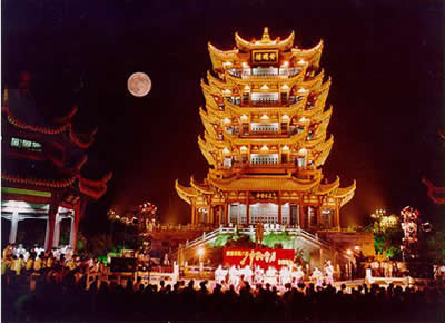 號稱江南三大名樓之一的黃鶴樓,原址在湖北武昌蛇山黃鶴磯頭,原為辛氏開設(shè)的酒店,一道士為了感謝她千杯之恩,臨行前在壁上畫了一只鶴,告之它能下來起舞助興。從此賓客盈門,生意興隆。過了十年,道士復來,取笛
