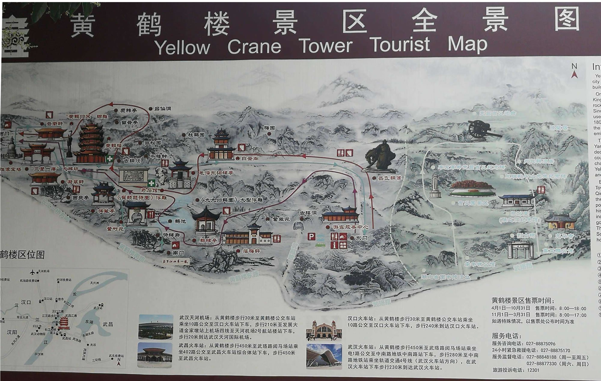 塔、碑廊、山門等建筑。整個建筑具有獨特的民族風格。黃鶴樓內(nèi)部,層層風格不相同。底層為一高大寬敞的大廳,其正中藻井高達10多米,正面壁上為一幅巨大的“白云黃鶴”陶瓷壁畫,兩旁立柱上懸掛著長達7米的楹聯(lián):爽氣西來,云霧掃開天地撼;大江東去,波濤洗凈古今愁。二樓大廳正面墻上,有用大理石鐫刻的唐代閻伯瑾撰寫的《黃鶴樓記》,它記述了黃鶴樓興廢沿革和名人軼事;樓記兩側(cè)為兩幅壁畫,一幅是“孫權(quán)筑城”,形象地說明黃鶴樓和武昌城相繼誕生的歷史;另一幅是“周瑜設(shè)宴”,反映三國名人去黃鶴樓的活動。三樓大廳的壁畫為唐宋名人的“繡像畫”,如崔顥、李白、白居易等,也摘錄了他們吟詠黃鶴樓的名句。四樓大廳用屏風分割幾個小廳,內(nèi)置當代名人字畫,供游客欣賞、選購。頂層大廳有《長江萬里圖》等長卷、壁畫!