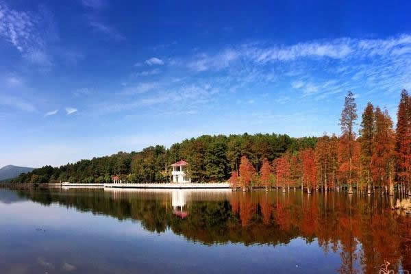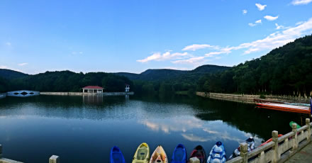 連理湖,三面環(huán)山,一面向沖,水碧林翠,鳥語花香,宛若瑤池,F(xiàn)今,白玉欄桿環(huán)湖而圍,天人閣、合一廊、九曲橋、回眸橋等景觀,與湖光山色渾然一體,成為國內(nèi)獨一無二的大型水上浪漫婚典勝地,特制的大彩船、小花船上,可舉辦各式婚典。