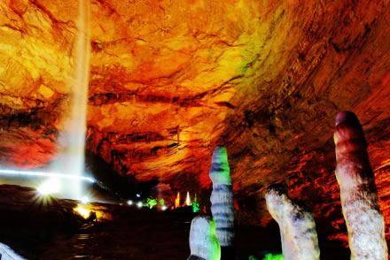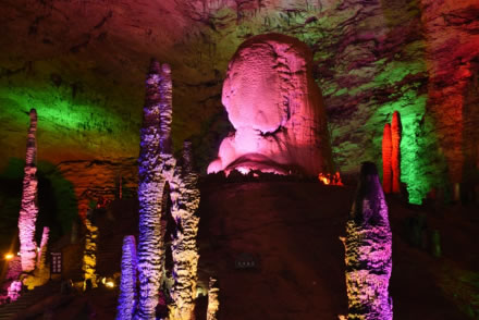 黃龍洞以立體的洞穴結構,龐大的洞穴空間,寬闊的廳堂及數(shù)以萬計的石筍,高大的洞穴瀑布,水陸兼?zhèn)涞挠斡[線等優(yōu)勢構成了極具特色的游覽洞穴,洞內有1庫、2河、3潭、4瀑、13大廳、98廊,以及幾十座山峰,上千個白玉池和近萬根石筍。由石灰質溶液凝結而成的石鐘乳、石筍、石柱、石花、石幔、石枝、石管、石珍珠、石珊瑚等遍布其中,無所不奇,無奇不有,仿佛一座神奇的地下“魔宮”。黃龍洞現(xiàn)已開放有龍舞廳、響水河、天柱街、天仙瀑、龍宮等6大游覽區(qū),主要景觀有定海神針、萬年雪松、龍王寶座、火箭升空、花果山、天仙瀑布、海螺吹天、雙門迎賓、滄海桑田、黃土高坡等100多個。