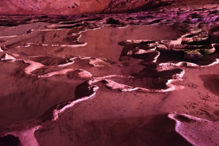 千丘田科學名稱為“流石壩”,也叫“酸田”, 它是水平流動的水在洞底流動過程中形成的碳酸鈣沉積。黃龍洞內大大小小的千丘田不計其數(shù),縱橫阡陌,形似一片片頗為壯觀的田園風光。
