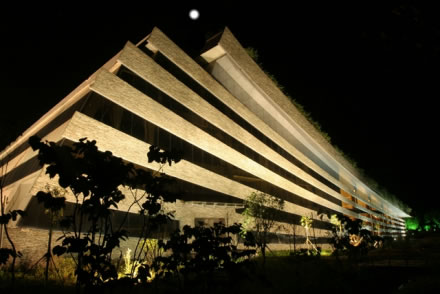黃龍音樂廳位于生態(tài)廣場入口處,由黃龍洞投資股份有限公司按國際標準建設,建筑面積為4970平方米,總投資1.6億元,座位818個。該音樂廳背靠植被茂盛的黃龍洞山體,面朝浩瀚的稻田,南鄰潺潺東流的索溪水。整個建筑為框剪式結構,3250平方米斜坡面屋頂全部為綠茵花草屋蓋,是全球最大的綠化屋頂;其外墻由當?shù)厍嗍搸r構建成的音符弦線幕墻與自然融合一體,形如一本即將展開等待世人閱讀的張家界文化寶典,又如鑲嵌在張家界的一塊翡翠,被譽為“世界環(huán)境最美音樂廳”。