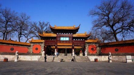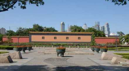 “萬仞宮墻”照壁面臨運(yùn)瀆,全長近百米。照壁南側(cè)有四個磚刻大字“萬仞宮墻”,每個字約1米見方。仞,是度量單位,我國古代八尺或七尺叫做一仞!叭f仞宮墻”出自《論語·子張篇》:“……夫子之墻高數(shù)(萬)仞,不得其門而入”,意思是贊喻孔子知識淵博,道德文章水平非常之高。