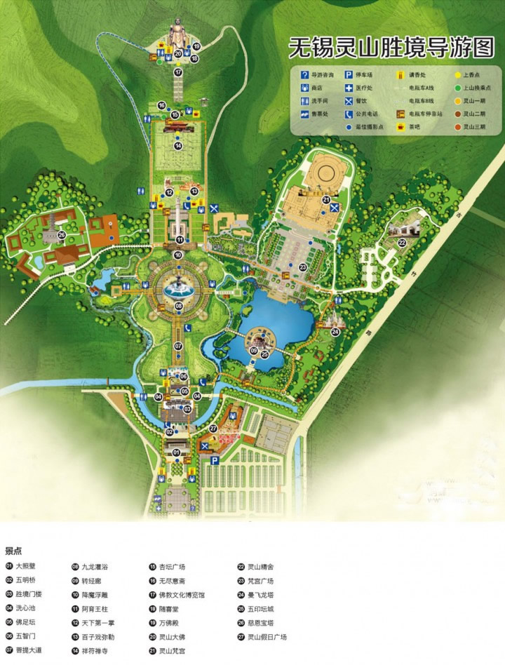 要的關(guān)系。靈山勝境的整個(gè)地形尤如一張?zhí)珟熞危晨啃§`山,左邊青龍山,右邊白虎山,北踏青峰,盡攬山形之美,南望太湖,一挹水色之秀,這種傳統(tǒng)風(fēng)水理論上稱(chēng)為"八風(fēng)吹不動(dòng),端坐紫金蓮"的地形是大吉之地,為保存這吉祥的靈氣,所以造大照壁來(lái)收氣,同時(shí)也通過(guò)照壁上的內(nèi)容引領(lǐng)游客走進(jìn)靈山的佛教文化歷史世界。