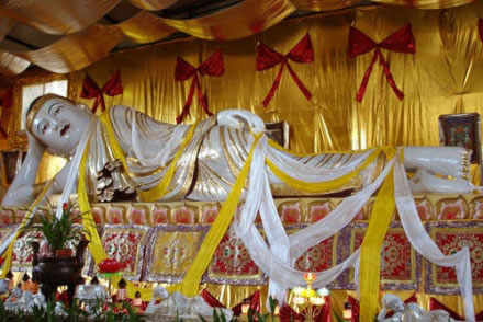釋迦牟尼涅槃像由名貴的緬甸白玉精雕細琢而成。白玉毛料1999年在緬甸發(fā)現(xiàn),歷經(jīng)三年艱苦開采,始現(xiàn)于世。玉料為一塊完整一體的純天然玉料。據(jù)玉材的天然造型,經(jīng)過精心設(shè)計,由德純藝高的工匠歷兩年時間精工雕成。佛像長8.9米,高2.45米,總寬1.35米,體型比例均確。玉佛全身鑲嵌有1500多粒紅、藍、紫晶寶石和翡翠,衣紋和蓮花臺由24K黃金鎦金而成,彩繪部分采用天然石色彩畫而成。