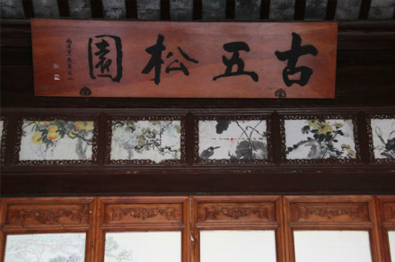 清康熙時獅子林內(nèi)有五棵參天古松,故獅子林又名五松園。古五松園現(xiàn)為東西向廳堂,“古五松園”匾由蘇局仙題。匾額下,吳致木先生作絹質(zhì)五松聯(lián)屏一幅。