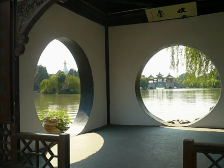 揚州是中國的月亮城,揚州賞月的地方很多,月觀就是其中之一。月觀坐西朝東,前臨開闊的湖面,每當皓月東升,憑欄而立,天上水中的兩個月亮交相輝映。月觀中的海梅家具也很有特點,雕刻的內(nèi)容都和賞月有關(guān)。蓮花、鴛鴦、荷葉,藕節(jié)是揚州木雕工藝的代表作品。