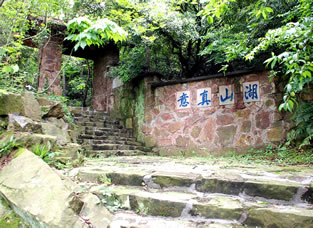 黿頭渚牌樓建于1973年,是前黿頭渚風(fēng)景區(qū)的老大門,是無錫十八景之首“黿渚春濤”的序幕!包x”是形似海龜?shù)囊环N動(dòng)物,“渚”是指三面臨水的小陸地,因?yàn)樗鼱钊琰x頭而叫黿頭渚。門樓背后刻有“山輝川媚”4個(gè)大字,點(diǎn)出了這里“山不高而秀雅,水不深而遼闊”風(fēng)景的特色。大道前面,有300米的杜鵑坡,杜鵑花是無錫市的市花,清明時(shí)節(jié)樹叢、林下、溪邊的杜鵑花開遍山野,映的滿山都是紅色。兩邊是香樟樹,它是無錫的市樹。