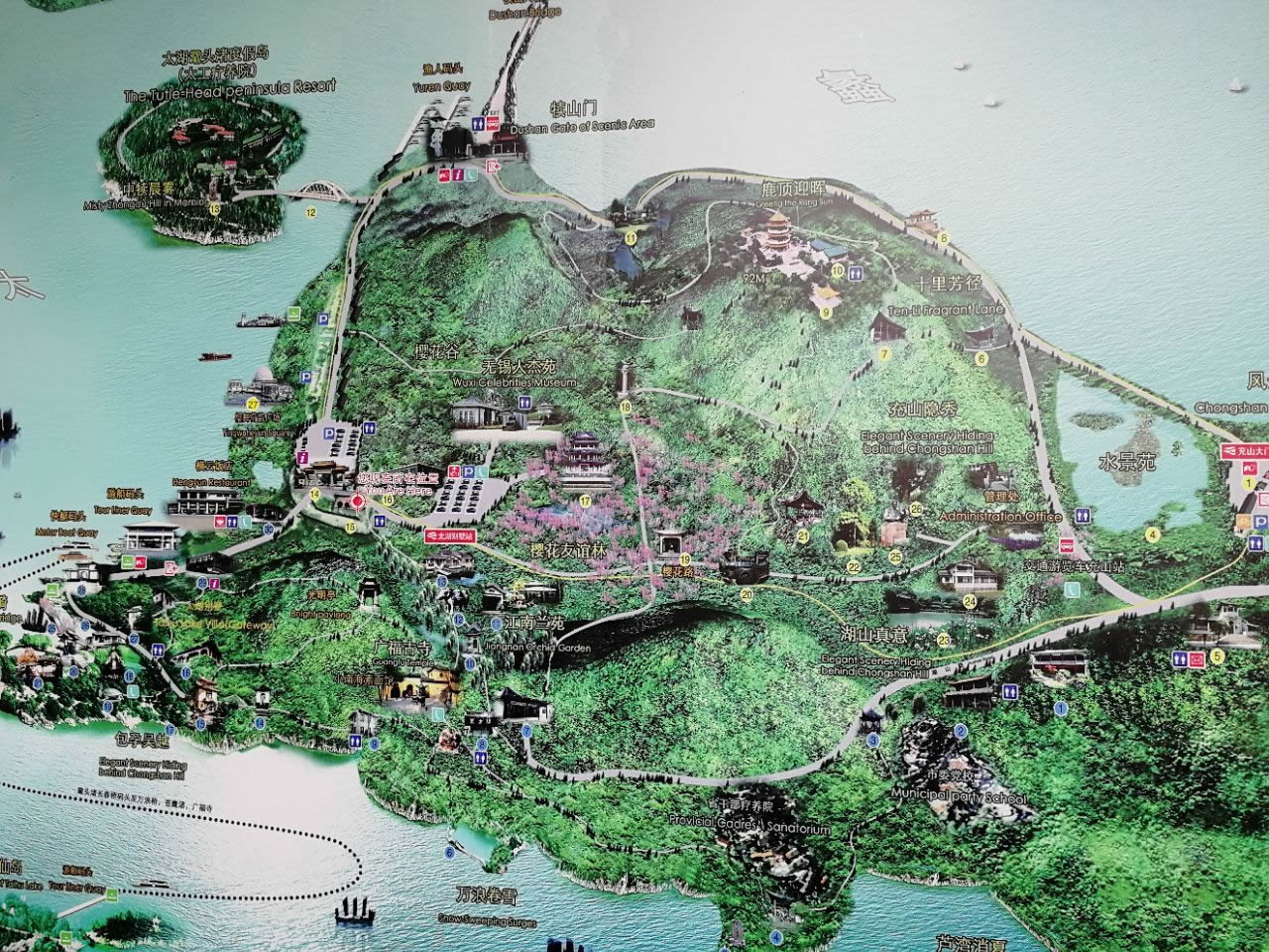 黿頭渚風(fēng)景區(qū)有充山隱秀、鹿頂迎暉、黿渚春濤、橫云山莊、萬浪卷雪、湖山真意、十里芳徑、太湖仙島、江南蘭苑、櫻花谷、無錫人杰苑及中犢晨霧、廣福古寺等10多處景點(diǎn)。其中有自然山水畫卷;有山鄉(xiāng)田園風(fēng)光;有江南園林景致;還有吃、住、購、行等配套齊全的服務(wù)和娛樂設(shè)施,加上歷代名人雅士游蹤、石刻、書畫、傳說等諸多內(nèi)涵深厚的文化積淀,構(gòu)成了此地以天然山水為主、人工點(diǎn)綴為輔的綜合性、多功能風(fēng)景旅游勝地。