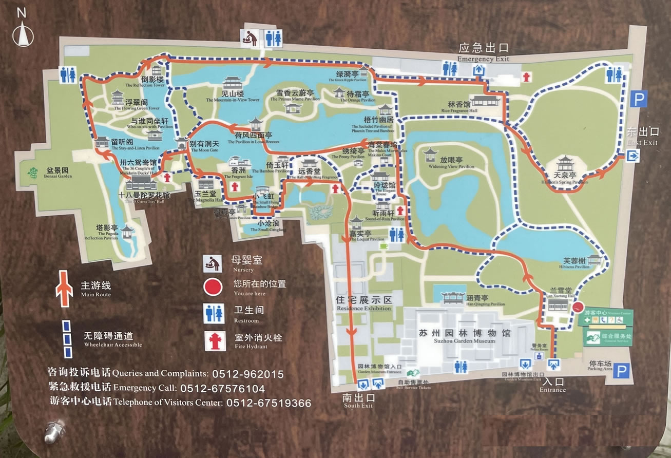 全園分東、中、西三部分?傮w布局特點(diǎn),東疏西密,綠水環(huán)繞,水面面積約占全園面積1/3,水是全園的紐帶和靈魂。東部地勢空曠,平崗草地,竹塢曲水,芙蓉樹、天泉亭等亭閣點(diǎn)綴其間。蘭香堂是東部主廳,廳中部屏門南側(cè)為漆雕《拙政園全景圖》,把全園景色融于一壁。中部以遠(yuǎn)香堂為主體,山水明秀,廳榭典雅,花木繁茂,是全園的精華所在。從東部進(jìn)入中園,一泓清池映入眼簾,古樹,垂柳拂水,湖石峻秀。遠(yuǎn)處一洞隱約可見。池南廳堂林立,錯落有致。池北巖島,溪橋相連,百年楓楊。
