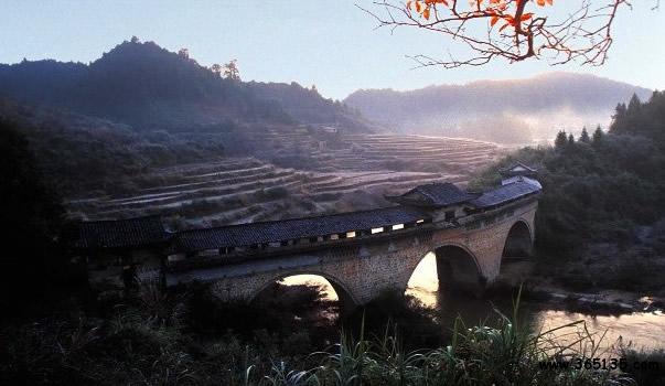 玉帶橋:因其弧形如玉帶,故名。玉帶橋為當(dāng)?shù)馗晃逃囡L(fēng)歧募資建于清乾隆五年(公元1740年),又名“風(fēng)歧橋”。玉帶橋為二墩三孔屋樓式拱橋,橋身成弧行,橋長88.15米,是江南現(xiàn)存最長的弧形廊橋,它以結(jié)構(gòu)獨特,氣勢雄偉而聞名贛粵。留下了“遠(yuǎn)近聞名玉帶橋,兩岸峻峰入云霄。奔騰河水瀉千里,玉帶飛鎮(zhèn)兩山腰”的贊譽。