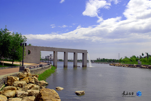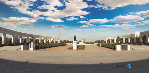 規(guī)劃采用中國(guó)傳統(tǒng)與西方造園學(xué)說(shuō)和現(xiàn)代規(guī)劃理念相結(jié)合的構(gòu)思,達(dá)到了自然與人文的和諧統(tǒng)一,主入口大門(mén)及兩側(cè)弧形引導(dǎo)墻,沿中軸線對(duì)稱布局相得益彰;不對(duì)稱的景觀廣場(chǎng),運(yùn)用巧妙的軸線轉(zhuǎn)折,通過(guò)拱形橋與主題雕塑遙相呼應(yīng)。