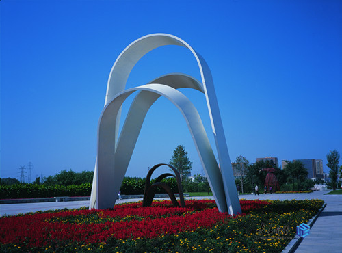 從長(zhǎng)春世界雕塑公園的東門(mén)開(kāi)始,拾級(jí)而上,就能夠到達(dá)“和平廣場(chǎng)”。廣場(chǎng)正中矗立著美國(guó)雕塑家馬克?威斯白克創(chuàng)作的“和平的延伸”。該作品由大小兩組曲面構(gòu)成兩扇門(mén)的形式,跨立在大理石路面當(dāng)中,形成由遠(yuǎn)及近的視覺(jué)沖擊感,象征著和平之路的延伸,表達(dá)了人類對(duì)和平與美好的共同期盼。雕塑主體周?chē)袛?shù)個(gè)花壇,經(jīng)常種植紫色,黃色等多彩的草本花朵,很多攝影愛(ài)好者都選擇面向東門(mén)的方向拍攝,藍(lán)天白云與延伸感的視點(diǎn),讓人感到平靜祥和。