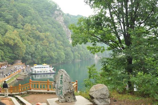 三角龍灣水面面積50公頃,湖中最大水深104米,蓄水量達1000萬立方米。因水面呈三角形,加之湖南側(cè)矗立著30米高的三角石,故名“三角龍灣”。